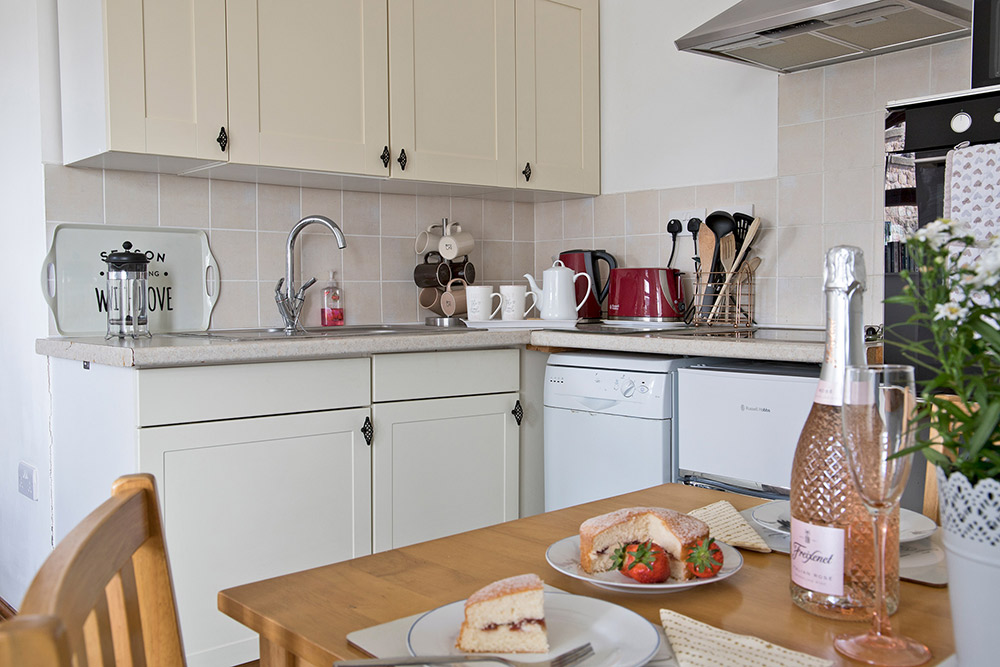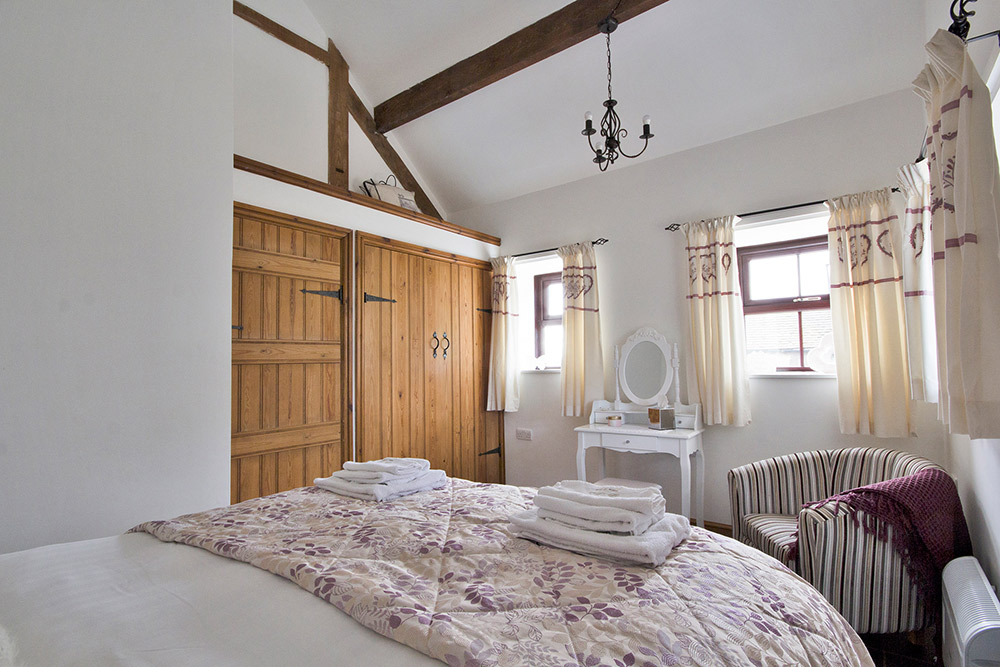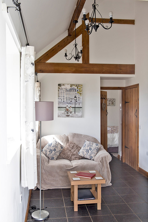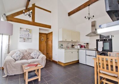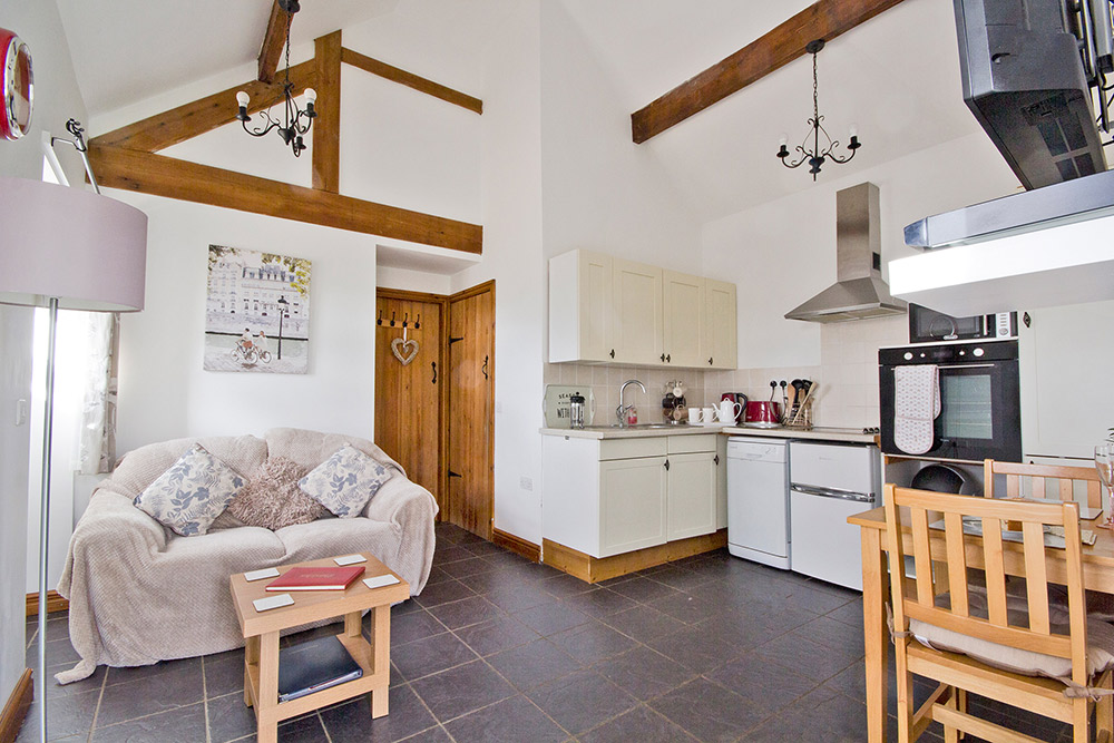 Swallow Cottage is a cosy one bedroom cottage with underfloor heating, a modern bathroom and open plan living including a well-equipped kitchen, dining area and seating area with full-height ceilings exposing the original roof beams.